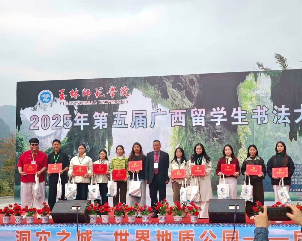 At the competition, two students from the Faculty of Foreign Languages—Ly Hong Kien and Le Dinh Man—demonstrated remarkable composure, a deep understanding of the Chinese language and culture, and strong calligraphy skills. As a result, both students earned places among the Top 10 outstanding contestants. Notably, Ly Hong Kien won the championship (Top 1), while Le Dinh Man achieved a Top 8 ranking, bringing honor to the University and the Faculty of Foreign Languages. Beyond their professional achievements, the moment when the two students were personally presented with awards, shook hands with, and received words of encouragement from the Chairman of the Board of Directors of the Guangxi Chinese Calligraphy Association affirmed the value and recognition of their persistent efforts in learning and long-term training over time.